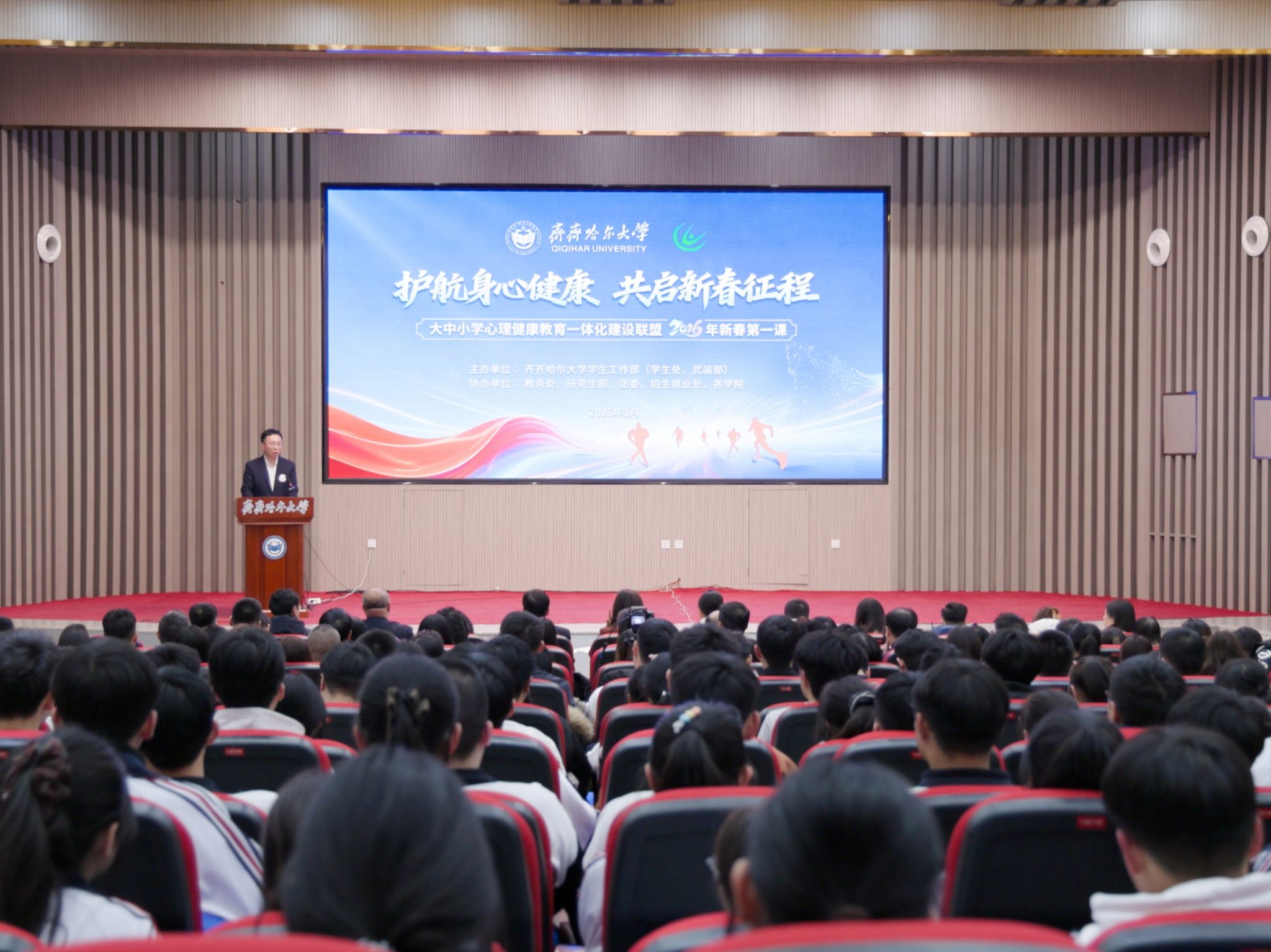 為深入貫徹落實(shí)教育部“健康第一”工作部署,扎實(shí)推進(jìn)健康學(xué)校建設(shè),深化齊齊哈爾大學(xué)-齊齊哈爾市大中小學(xué)心理健康教育一體化聯(lián)盟建設(shè),3月4日,齊齊哈爾大學(xué)以“主會場+分會場”線上線下聯(lián)動形式,舉辦大中小學(xué)心理健康教育一體化建設(shè)聯(lián)盟2026年新春第一課。本次活動以“護(hù)航身心健康、共啟新春征程”為主題,覆蓋全校本碩在校生,相關(guān)職能部門參與,同時(shí)邀請齊齊哈爾市計(jì)劃生育協(xié)會、齊齊哈爾高等師范專科學(xué)校、齊齊哈爾大學(xué)附屬中學(xué)、齊齊哈爾市師范學(xué)校附屬小學(xué)等聯(lián)盟單位干部師生代表共同參與。