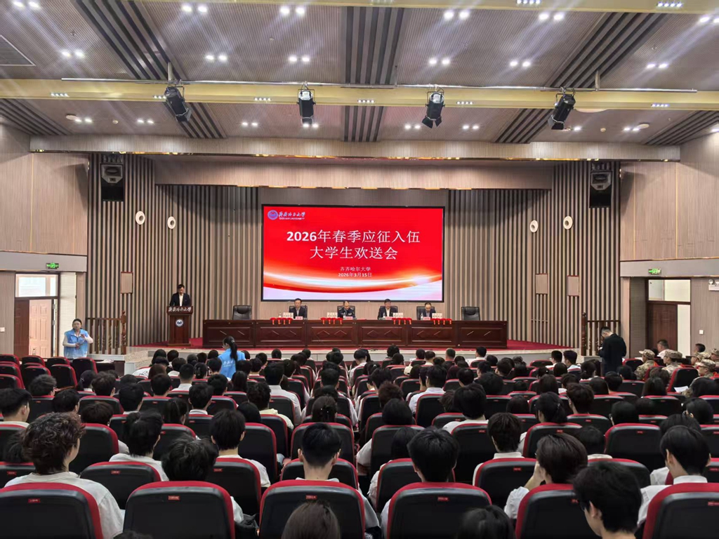 3月15日上午,齊齊哈爾大學(xué)2026年春季應(yīng)征入伍大學(xué)生歡送會在日新大廈4樓報告廳隆重舉行。建華區(qū)人民武裝部上校政治委員欒新偉,校黨委副書記張文治,學(xué)生工作部(學(xué)生處、武裝部)相關(guān)同志、各學(xué)院黨委副書記、輔導(dǎo)員及學(xué)生代表參會。
