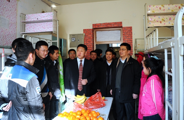 我校今年有部分學(xué)生或因?yàn)榧彝ポ^遠(yuǎn)、或復(fù)習(xí)考研、或留在學(xué)校附近打工等原因沒有回家過年,為了方便同學(xué)們的生活和學(xué)習(xí),他們集中在16號學(xué)生公寓和德潤大廈住宿。我校每年都對留校同學(xué)尤其是留校的家庭經(jīng)濟(jì)困難學(xué)生十分關(guān)心,學(xué)生處領(lǐng)導(dǎo)給留校學(xué)生送去水果、瓜子、糖果等食品。此次校領(lǐng)導(dǎo)專程到學(xué)生公寓看望學(xué)生,并與他們一起吃團(tuán)圓飯?jiān)僖淮误w現(xiàn)了學(xué)校對學(xué)生的關(guān)心和愛護(hù)。