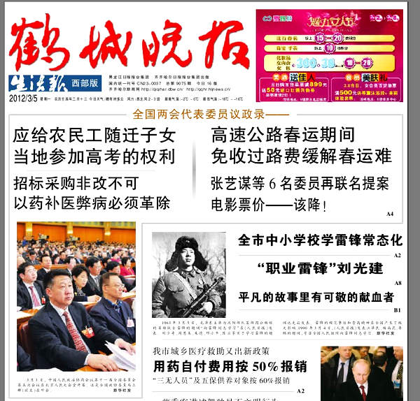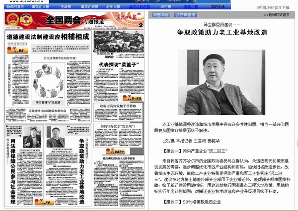 2012年3月4日,《黑龍江日報》以《馬立群委員建議——爭取政策助力老工業(yè)基地改造》為題,對全國政協(xié)委員、我校校長馬立群的建言提案做了圖文并茂的熱忱報道。