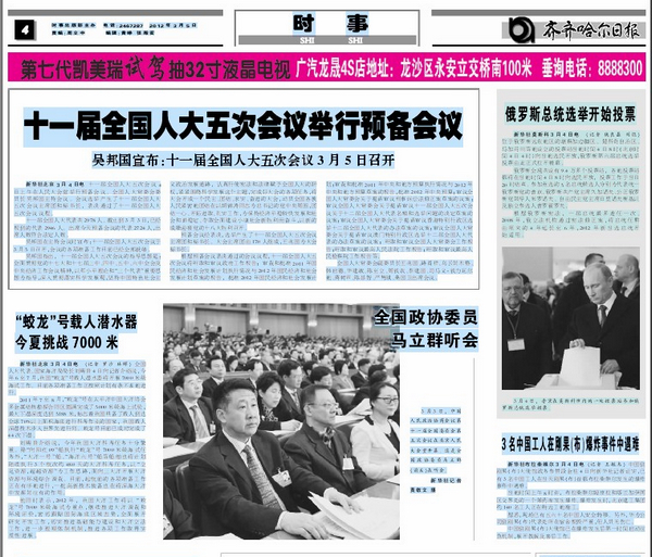 3月5日,《齊齊哈爾日報》、《鶴城晚報》以《全國政協(xié)委員馬立群委員聽會》為題,對全國政協(xié)委員、我校校長馬立群“兩會”履職工作做了圖文報道。