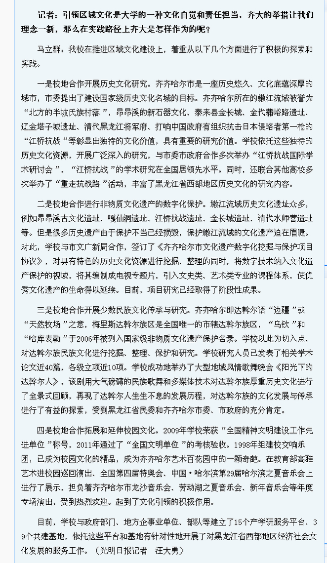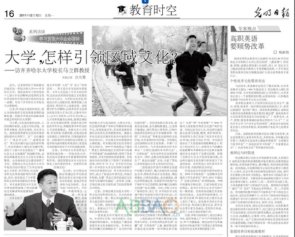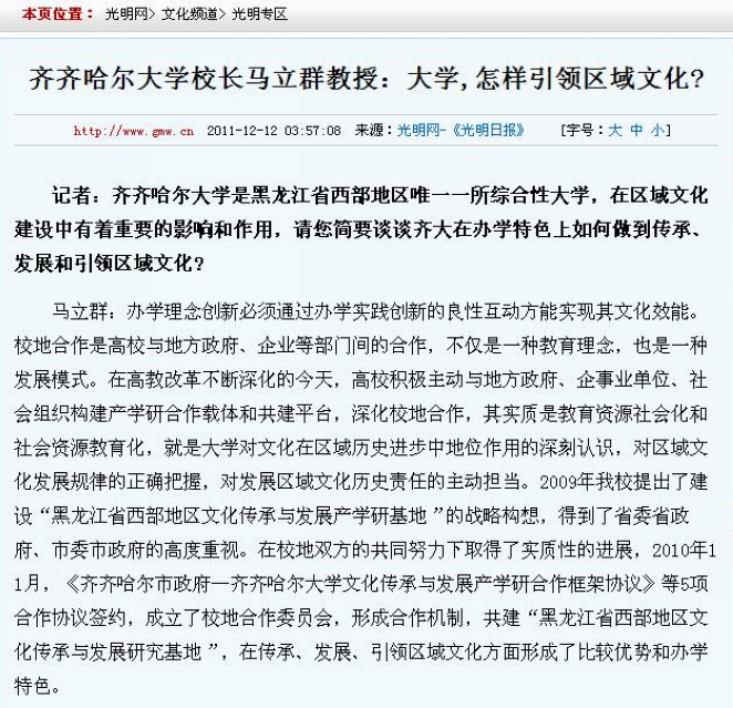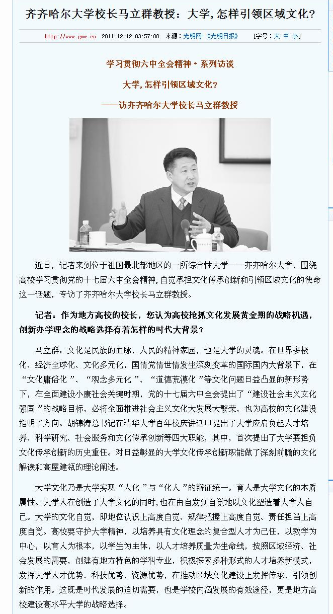 2011年12月12日,《光明日報》“教育時空”版的《學(xué)習(xí)貫徹六中全會精神·系列訪談》專欄以《大學(xué),怎樣引領(lǐng)區(qū)域文化?——訪齊齊哈爾大學(xué)校長馬立群教授》為題刊發(fā)了記者汪大勇與校長馬立群教授的訪談錄。