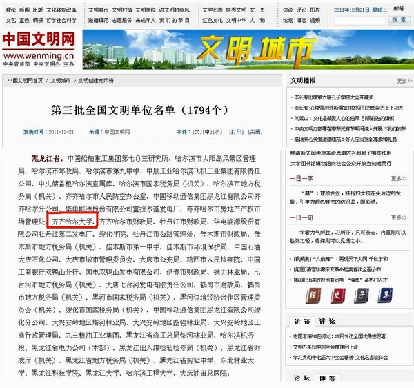 文明花開,再傳捷報。全國精神文明建設工作表彰大會于2011年12月20日上午在北京隆重舉行。中共中央政治局常委、中央文明委主任李長春出席并講話。中共中央政治局委員、書記處書記、中宣部部長、中央文明委副主任劉云山主持會議。中共中央政治局委員、國務委員、中央文明委副主任劉延東宣讀了表彰決定,授予27個全國文明城市(區(qū))、899個全國文明村鎮(zhèn)、1794個全國文明單位,繼續(xù)保留23個城市(區(qū))的全國文明城市(區(qū))榮譽稱號。我校被中央文明委授予全國文明單位榮譽稱號,這是我校繼2009年獲得全國精神文明建設工作先進單位后取得的又一殊榮。
