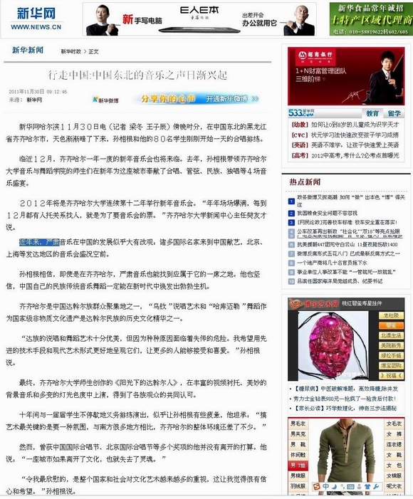 近日,新華社黑龍江分社記者梁冬、王子辰深入我校進(jìn)行采訪,并以“中國東北的音樂之聲日漸興起”為題進(jìn)行報道,引起了國內(nèi)多家媒體廣泛關(guān)注,在社會產(chǎn)生了積極影響。