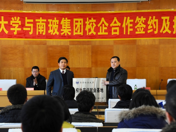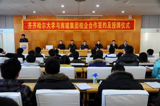 儀式上,副校長鄭喜群與南玻集團(tuán)生產(chǎn)總監(jiān)黃家鴻共同簽署了有關(guān)合作協(xié)議,并互授“齊齊哈爾大學(xué)校外實訓(xùn)就業(yè)基地”和“南玻集團(tuán)材料專業(yè)人才培訓(xùn)基地”牌匾。