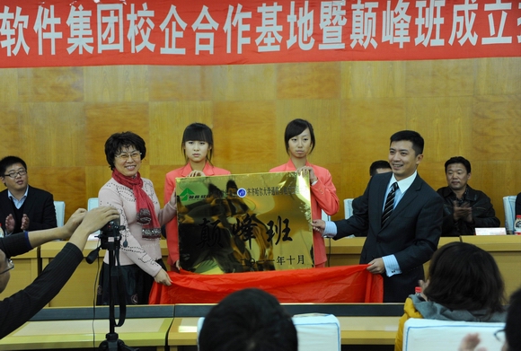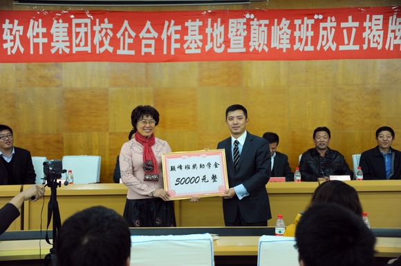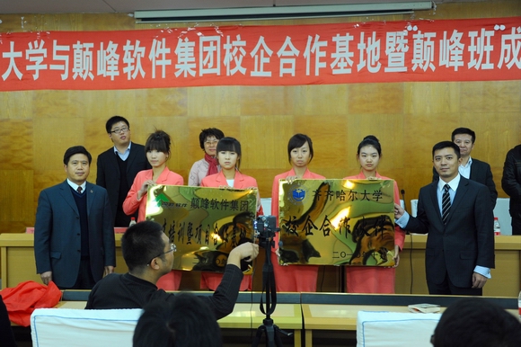 在熱烈的掌聲中,副校長鄭喜群和顛峰軟件集團總裁吳劍為齊齊哈爾大學與顛峰軟件集團校企合作基地成立揭牌;通信與電子工程學院常務副院長姚仲敏和顛峰軟件集團總裁吳劍先生為“顛峰班”成立揭牌;顛峰軟件集團總裁吳劍為首屆“顛峰班”頒發(fā)獎助學金伍萬元。