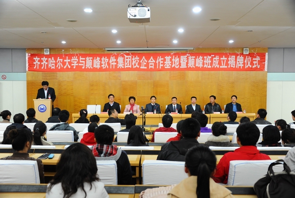 他指出,齊齊哈爾大學與顛峰軟件集團憑借各自的優(yōu)勢進行校企合作,這既能促進齊齊哈爾大學在培養(yǎng)踏實敬業(yè)、會學善用的應用型高級專門人才方面的深入和擴展,同時也為顛峰軟件集團的進一步加速發(fā)展和可持續(xù)發(fā)展提供了強有力的人才支持,這既是一次難得的強強聯(lián)手,更是一次互利雙贏的合作。經過校企雙方一年多的實踐探索、交流與合作,實現了技術人才培養(yǎng)模式的創(chuàng)新,體現了教育必須適應經濟社會發(fā)展的內在需求的基本規(guī)律。通過理論培訓與實踐鍛煉,使大學生充分認識到自身的能力水平與社會需求之間的差距,增強了社會責任感和使命感,縮短了大學畢業(yè)生適應社會的周期。實踐證明,校企合作培養(yǎng)出來的學生既有扎實的文化專業(yè)知識基礎,又有與崗位能力要求相對接的專業(yè)技能。校企合作培養(yǎng)出的學生,企業(yè)滿意、學校滿意、學生滿意、家長滿意。他強調,讓我們以揭牌為新的契機,更好地發(fā)揮學校自身的教學科研和人才優(yōu)勢,更好地發(fā)揮顛峰軟件集團的資源和市場優(yōu)勢,共同培養(yǎng)社會與企業(yè)需要的人才,真正形成校企雙方互動雙贏的良好格局,祝愿我校與顛峰軟件集團的合作取得豐碩成果!