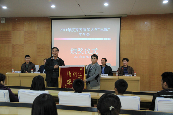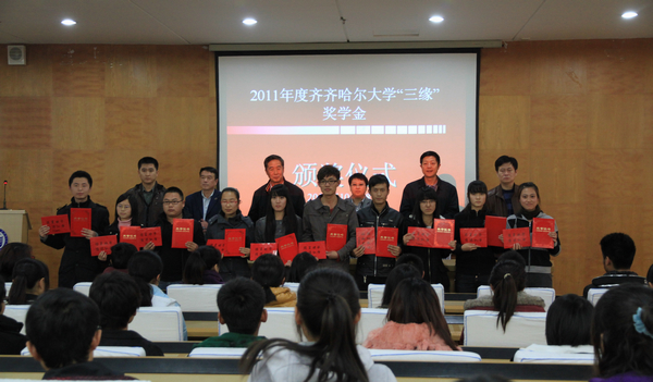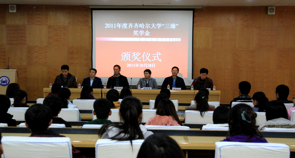 2011年10月28日下午,2011年度齊齊哈爾大學(xué)“三緣”獎(jiǎng)學(xué)金頒獎(jiǎng)儀式在西主七樓學(xué)術(shù)報(bào)告廳隆重舉行。