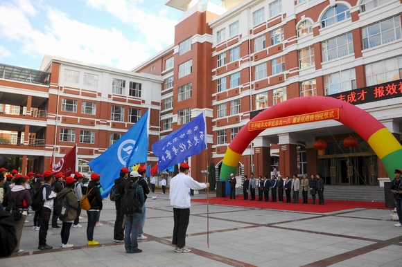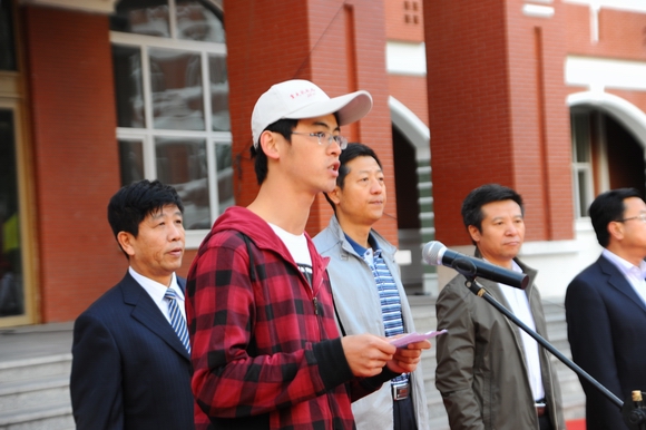 在出征儀式上,我校文學(xué)與歷史文化學(xué)院2011級(jí)歷史系研究生劉賀代表參加“重走抗戰(zhàn)路”主題活動(dòng)的全體學(xué)生在啟動(dòng)儀式上發(fā)言,表達(dá)了“永遠(yuǎn)跟黨走、永鑄民族魂”的堅(jiān)強(qiáng)決心,發(fā)出了當(dāng)代大學(xué)生弘揚(yáng)抗戰(zhàn)精神、勇?lián)鷷r(shí)代重任的鏗鏘誓言。