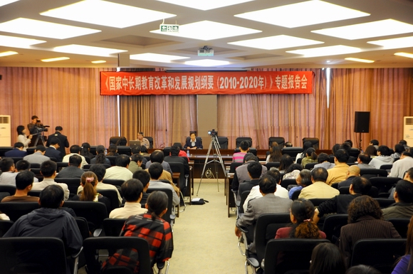 9月23日上午,德潤大廈四樓會議室座無虛席,《國家中長期教育改革和發(fā)展規(guī)劃綱要》專題報(bào)告會在此隆重舉行。我校邀請的華中師范大學(xué)范先佐教授為全校副處以上干部,各教學(xué)單位系主任、學(xué)科帶頭人及部分學(xué)生代表做了題為《國家中長期教育改革和發(fā)展規(guī)劃綱要》出臺的背景、亮點(diǎn)及值得注意的問題專題報(bào)告。報(bào)告會由黨委副書記王鳳琴主持。