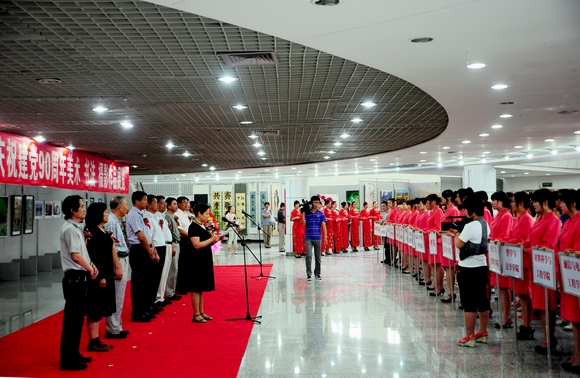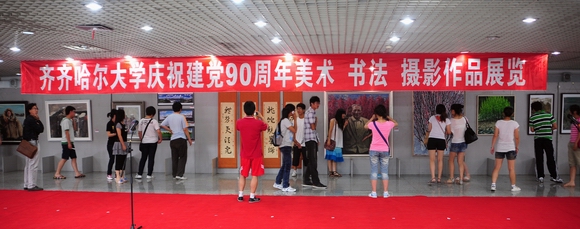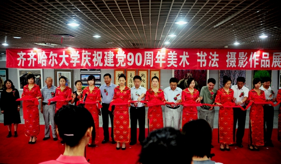 6月27日上午9點(diǎn),我校慶祝建黨90周年美術(shù)、書法、攝影作品展在美術(shù)館開展。我校領(lǐng)導(dǎo)李海紅、馬立群、王鳳琴、呂曉輝,齊齊哈爾市委宣傳部副部長邱利鋒、文聯(lián)主席莊樹謙、美術(shù)家協(xié)會(huì)副主席、秘書長宮秀志、攝影家協(xié)會(huì)主席陳壽安等領(lǐng)導(dǎo)出席開展儀式并剪彩。學(xué)校黨群職能部門和各學(xué)院負(fù)責(zé)人及全校師生代表參加了剪彩儀式。剪彩儀式由黨委宣傳部部長李敏義主持。