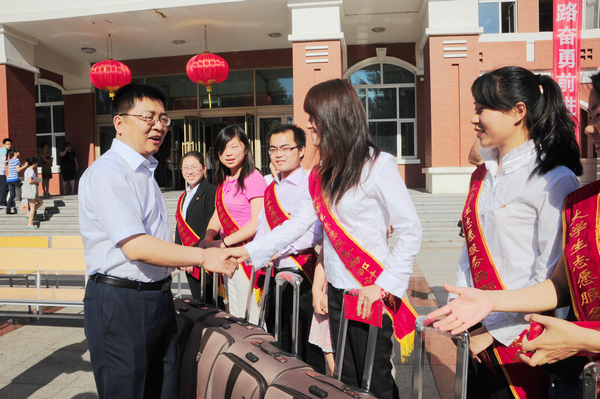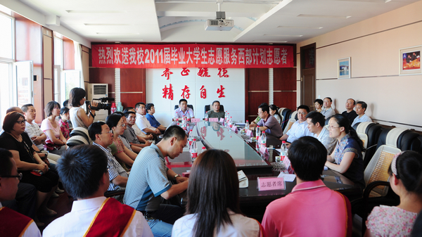 學(xué)子志愿赴西部,師友歡送母校情。2011年7月1日,恰值中國(guó)共產(chǎn)黨成立90周年的喜慶日子,我校15名“2011屆畢業(yè)生大學(xué)生西部計(jì)劃志愿者”即將背起行囊奔赴新疆生產(chǎn)建設(shè)兵團(tuán)、新疆維吾爾自治區(qū)、內(nèi)蒙古自治區(qū)和黑龍江省的基層一線開(kāi)展志愿服務(wù)。學(xué)校在中區(qū)504會(huì)議室為“2011屆畢業(yè)大學(xué)生西部計(jì)劃志愿者”舉行了隆重而熱烈的歡送儀式,為他們壯行。校黨委書記李海紅,校黨委副書記蓋元臣出席歡送儀式并寄語(yǔ)大學(xué)生志愿者。