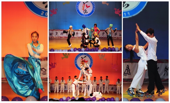 社團(tuán)展演在健美操協(xié)會熱情奔放的開場舞中拉開帷幕。演出形式多樣、各具特色、異彩紛呈,由社團(tuán)聯(lián)合會藝術(shù)團(tuán)帶來的歌曲串燒,動聽感人;DB舞團(tuán)的機(jī)械舞《Game》充分展現(xiàn)了青春的動感魅力;黑馬戲劇協(xié)會帶來的獨(dú)舞《鴻雁》表現(xiàn)了游子對家鄉(xiāng)的深深眷念。由燭光詩社和書法協(xié)會共同帶來的詩朗誦,配以現(xiàn)場書法表演,充分展示了當(dāng)代大學(xué)生開拓創(chuàng)新、奮發(fā)有為的精神風(fēng)貌;配樂詩朗誦《我的祖國》表達(dá)了對青年學(xué)子對偉大祖國無限真誠與熱愛。勁爆的熱舞,美妙的歌曲,奇幻的魔術(shù),幽默的短劇,意蘊(yùn)悠遠(yuǎn)的古詩朗誦,技藝精湛的武術(shù)表演一次次將活動推向高潮,既體現(xiàn)了各學(xué)生社團(tuán)的獨(dú)特魅力與亮點(diǎn),又彰顯了當(dāng)代大學(xué)生朝氣蓬勃、昂揚(yáng)向上的青春氣息。學(xué)生社團(tuán)活動展演文藝演出在二重唱《手拉手,心連心》的悠揚(yáng)旋律中落下帷幕。