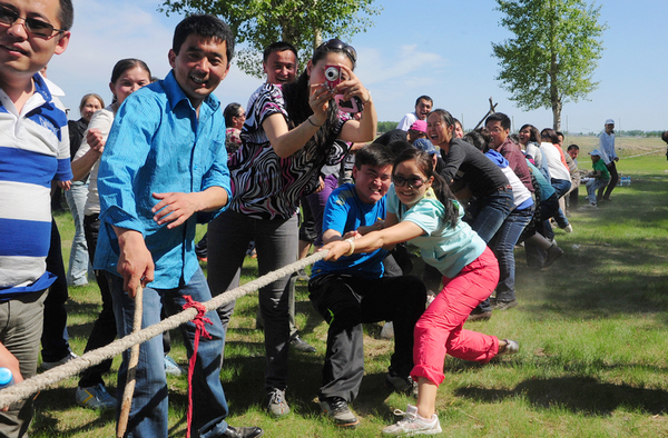 嫩江之濱載歌舞,民族和諧一家親。在欣賞、演繹完“庫木勒”節(jié)文藝節(jié)目之后,新疆阿勒泰地區(qū)赴齊齊哈爾大學培訓班學員同與會領導和老師一起在大草原上舉行了拔河、唱歌、跳舞、彈唱冬不拉等文體活動,還分享了達斡爾族的傳統(tǒng)美食。