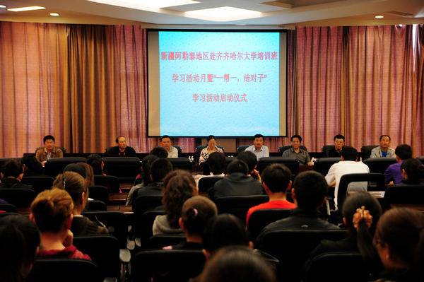 在啟動(dòng)儀式上,學(xué)?!盎ブそ涣鳌みM(jìn)步”學(xué)習(xí)活動(dòng)領(lǐng)導(dǎo)小組組長(zhǎng)、校團(tuán)委書記李秀梅宣讀了《新疆阿勒泰地區(qū)赴齊齊哈爾大學(xué)培訓(xùn)班學(xué)習(xí)活動(dòng)月暨“一幫一,結(jié)對(duì)子”學(xué)習(xí)活動(dòng)方案》;新疆阿勒泰地區(qū)赴齊齊哈爾大學(xué)培訓(xùn)班領(lǐng)隊(duì)鄭東仟在啟動(dòng)儀式講話中對(duì)阿勒泰地區(qū)赴齊齊哈爾大學(xué)培訓(xùn)班學(xué)員提出學(xué)習(xí)要求;大學(xué)生志愿者代表袁潔同學(xué)和新疆培訓(xùn)班學(xué)員卡畢拉·胡斯曼分別代表學(xué)生志愿者和培訓(xùn)班學(xué)員宣讀《“一幫一,結(jié)對(duì)子”學(xué)習(xí)活動(dòng)倡議書》。校團(tuán)委副書記趙振華宣布“一幫一,結(jié)對(duì)子”學(xué)習(xí)活動(dòng)結(jié)對(duì)名單。我校繼續(xù)教育學(xué)院院長(zhǎng)周廣慧在啟動(dòng)儀式講話中對(duì)“一幫一,結(jié)對(duì)子”活動(dòng)進(jìn)行了了部署和安排,號(hào)召大學(xué)生志愿者和培訓(xùn)學(xué)員在共同學(xué)習(xí)的過程中,建立深厚友誼,以實(shí)際行動(dòng)爭(zhēng)做民族團(tuán)結(jié)的友好使者。