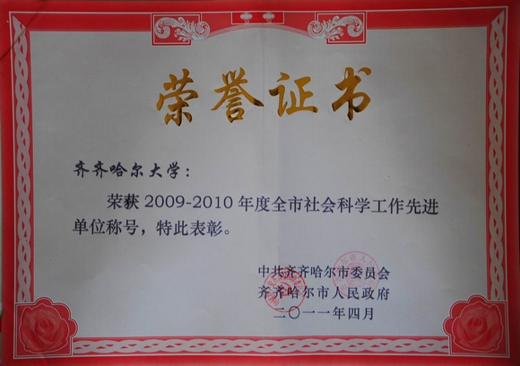 2011年4月25日,全市哲學(xué)社會科學(xué)工作會議在市黨政中心6號樓4樓會議室召開,市委、市人大、市政府、市政協(xié)及市社科聯(lián)的領(lǐng)導(dǎo)出席了會議,我校黨委副書記王鳳琴、黨委宣傳部長李敏義參加了會議。會上,表彰了2009—2010年度全市社會科學(xué)工作先進集體和先進個人,我校再次榮獲齊齊哈爾市社會科學(xué)工作先進單位,校黨委副書記王鳳琴、黨委宣傳部長李敏義、經(jīng)管學(xué)院院長王維、科技處副處長伊全勝、文學(xué)與歷史文化學(xué)院歷史系主任周彥、中文系主任趙忠山等被市委市政府命名為先進個人。