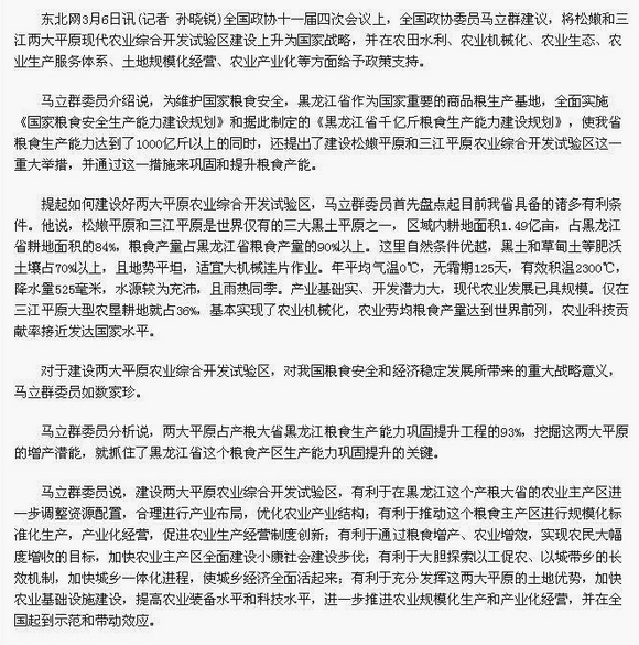 東北網(wǎng)3月6日以《馬立群:將松嫩三江平原現(xiàn)代農(nóng)業(yè)綜合開發(fā)上升為國家戰(zhàn)略》為題做了圖文并茂的熱忱報道。