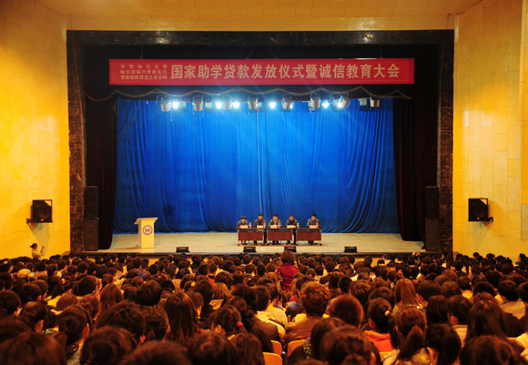 為更好地落實國家助學貸款政策,推動國家助學貸款工作良性發(fā)展,不斷增強學生誠信意識,樹立學生恪守誠信的良好社會形象,4月7日,我校在中區(qū)文化宮召開“國家助學貸款發(fā)放儀式暨誠信教育”大會,對2010年申請國家助學貸款學生進行誠信教育。我校國家助學貸款工作領導小組副組長、學生處副處長張樹啟,校國家助學貸款工作領導小組辦公室副主任、財務處副處長寧國祥、華安財產保險股份有限公司黑龍江學貸險部業(yè)務經理麻世銳、哈爾濱銀行股份有限公司學府支行助學貸款中心業(yè)務經理毛文俊及我校申請哈爾濱銀行股份有限公司國家助學貸款的1250余名學生參加了大會。學生處學生資助科科長李靜主持了大會。