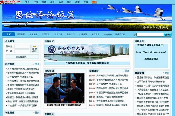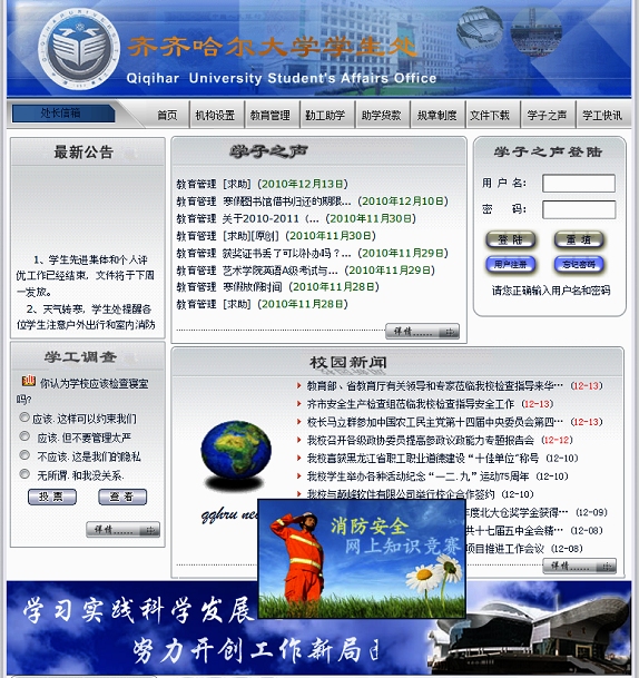 齊齊哈爾大學(xué)學(xué)生工作部(處)網(wǎng)站是學(xué)生工作的綜合性網(wǎng)站,為學(xué)校和廣大學(xué)生搭建起了交流互動(dòng)的平臺,更好地滿足廣大師生相互溝通的需求。該網(wǎng)站下設(shè)有機(jī)構(gòu)設(shè)置、教育管理、勤工助學(xué)、助學(xué)貸款、規(guī)章制度、文件下載、學(xué)子之聲和學(xué)工快訊等七大版塊;還設(shè)有處長信箱、學(xué)工調(diào)查等內(nèi)容,提供給學(xué)生更多與學(xué)校交流、溝通的空間;該網(wǎng)站時(shí)時(shí)滾動(dòng)更新的“最新公告”,第一時(shí)間為廣大同學(xué)傳達(dá)了最新的校園咨訊;定期開展的“網(wǎng)上知識競賽”充分調(diào)動(dòng)了廣大同學(xué)的參與熱情,更好地普及了相關(guān)知識,為營造和諧的校園文化氛圍提供了保障。該網(wǎng)站不僅提供了最新校園的動(dòng)態(tài),還為廣大同學(xué)提供了及時(shí)全面了解學(xué)校,了解自己的平臺。“學(xué)子之聲”欄目能夠?qū)W(xué)生們提出的問題及時(shí)反饋到校領(lǐng)導(dǎo)和相關(guān)部門,切實(shí)解決同學(xué)們遇到的問題。