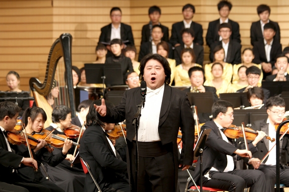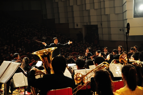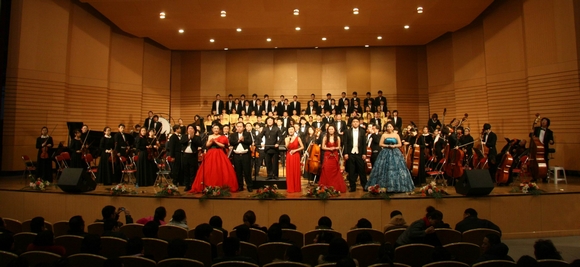 隨著演出總指揮、我校音樂與舞蹈學(xué)院院長、國家級著名音樂指揮家孫相根教授剛勁有力的手勢,音樂會在宏大的《紅旗頌》中拉開了的序幕。