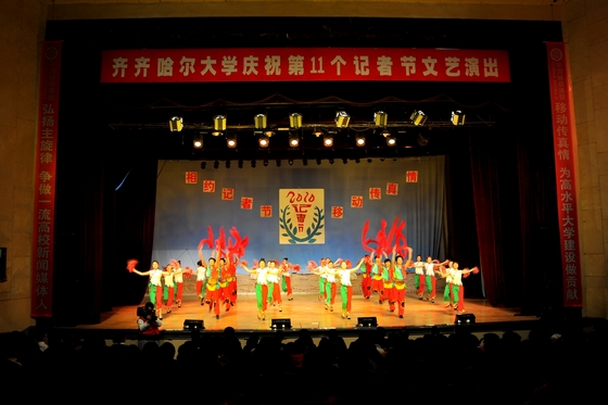 我校領(lǐng)導(dǎo)王鳳琴、蓋元臣、鄭喜群,齊齊哈爾市新聞中心主任、《光明日?qǐng)?bào)》駐齊記者站站長(zhǎng)覃華,齊齊哈爾移動(dòng)公司副總經(jīng)理馬振華,我校黨委宣傳部部長(zhǎng)李敏義,校團(tuán)委書記李秀梅,教育與傳媒學(xué)院黨委書記孟憲國(guó)、院長(zhǎng)李虹,校宣傳部副部長(zhǎng)、新聞中心主任樊友才等出席文藝演出。