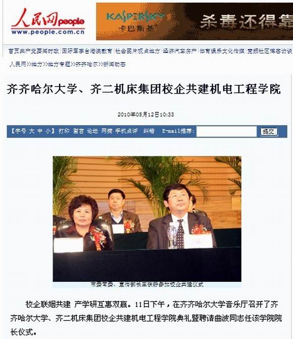 5月12日,人民網(wǎng)地方頻道:齊齊哈爾大學(xué)、齊二機(jī)床集團(tuán)校企共建機(jī)電學(xué)院
