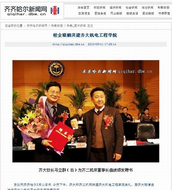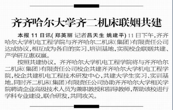 5月12日,黑龍江新聞網(wǎng):齊齊哈爾大學(xué)與齊二機(jī)床聯(lián)姻共建