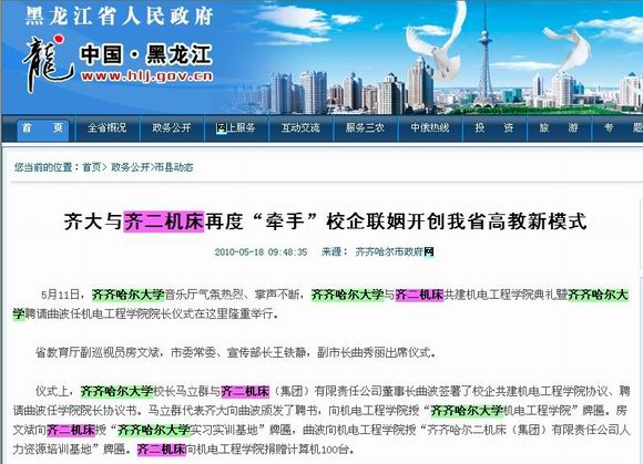 5月18日,黑龍江政府網(wǎng):齊大與齊二機(jī)床再度“牽手”校企聯(lián)姻開創(chuàng)我省高教新模式