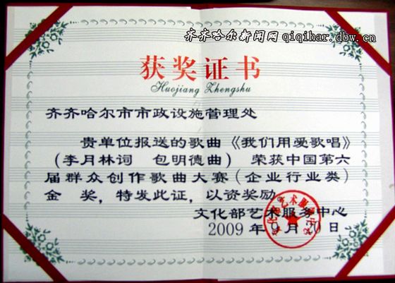 5月25日,由市城管監(jiān)察局副局長李月林作詞、我校音樂與舞蹈學(xué)院副院長包明德教授作曲的市政工人之歌《我們用愛歌唱》榮獲中國第六屆群眾創(chuàng)作歌曲大賽(企業(yè)行業(yè)類)金獎,并被編入中國廣播電視出版社出版的中國第六屆群眾創(chuàng)作歌曲大賽獲獎作品集《神州歌?!分?。