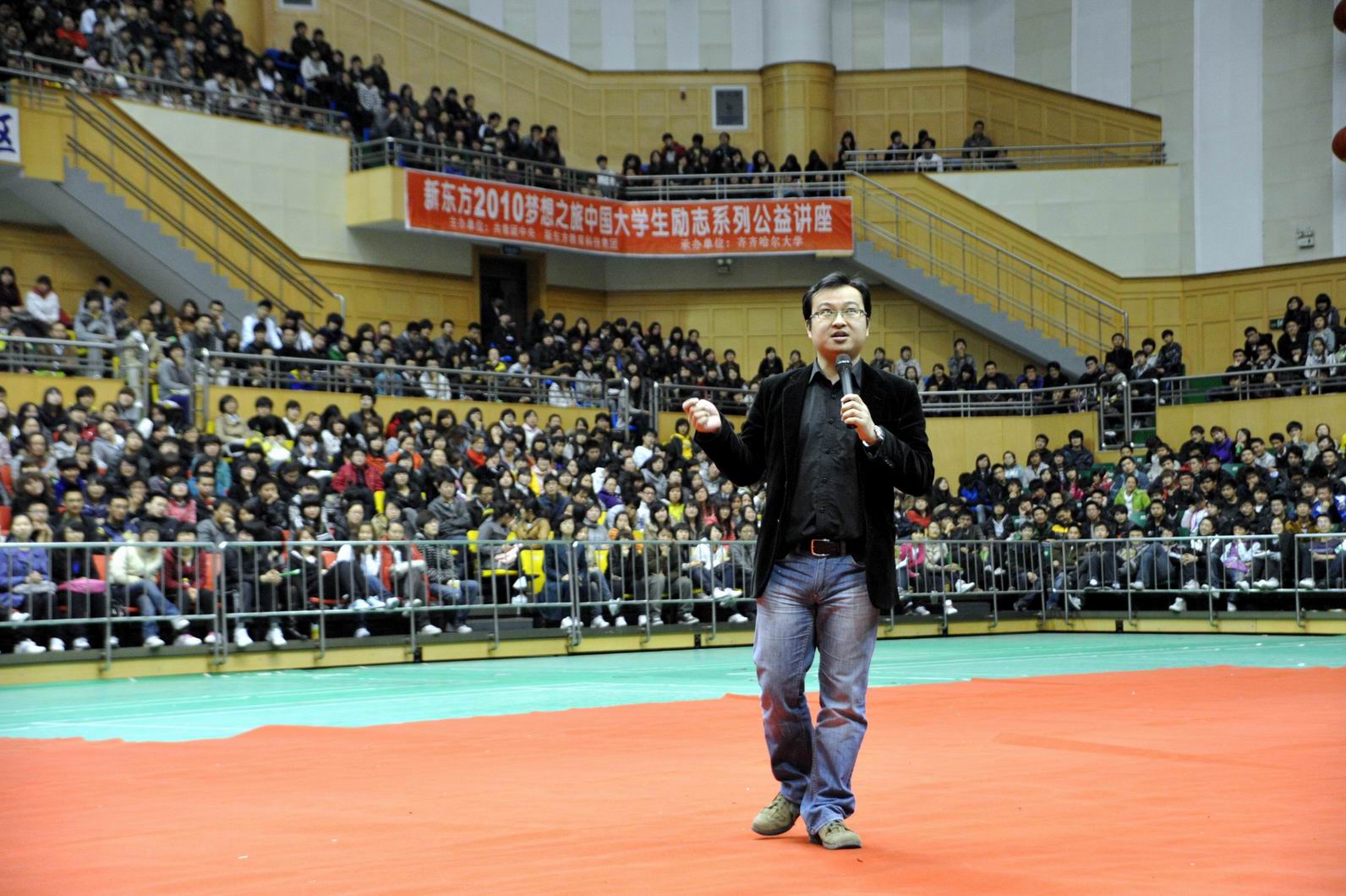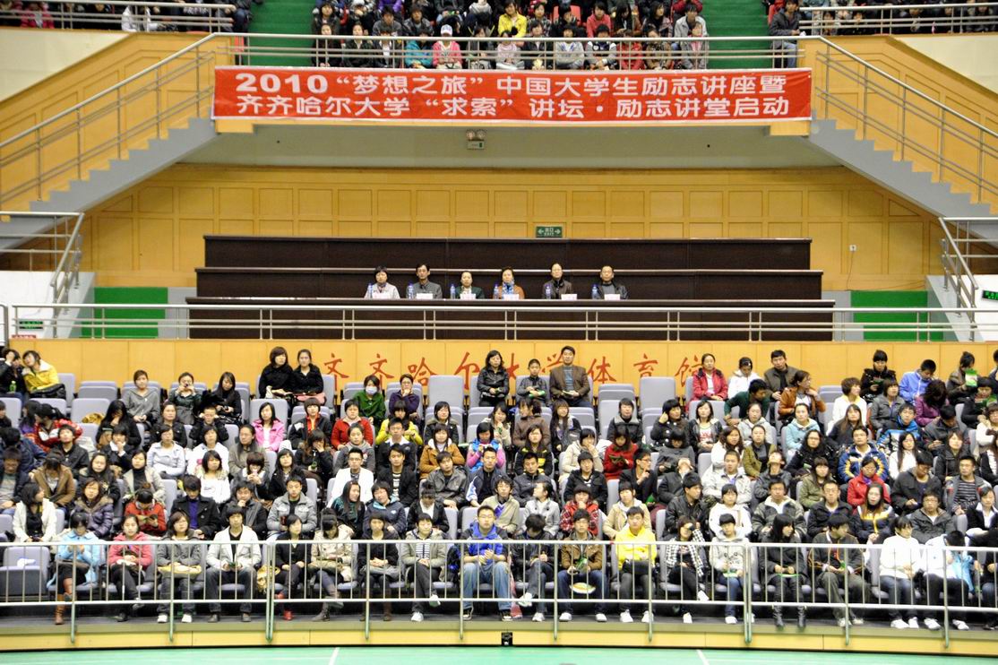4月16日晚7點(diǎn),由共青團(tuán)中央學(xué)校部、全國(guó)學(xué)聯(lián)辦公室、新東方教育科技集團(tuán)聯(lián)合舉辦的2010新東方“夢(mèng)想之旅”中國(guó)大學(xué)生勵(lì)志講座暨齊齊哈爾大學(xué)“求索”講壇·勵(lì)志講堂首場(chǎng)講座在我校體育館舉行。學(xué)校3000多名師生到場(chǎng)聆聽講座。學(xué)校黨委副書記王鳳琴、團(tuán)委書記李秀梅、學(xué)生指導(dǎo)中心李迎春等學(xué)校及部門領(lǐng)導(dǎo)出席活動(dòng)。