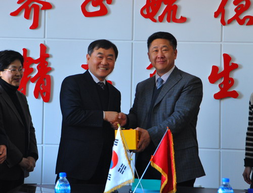 最后,馬立群校長(zhǎng)與裵度淳校長(zhǎng)在合作協(xié)議書(shū)上鄭重簽字,并互贈(zèng)禮物、合影留念。