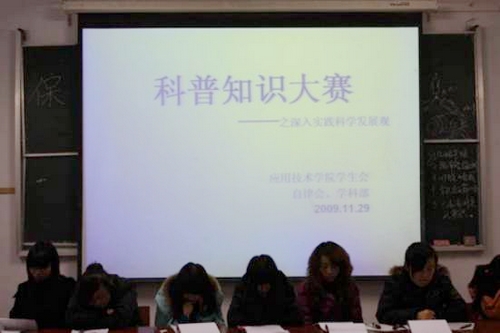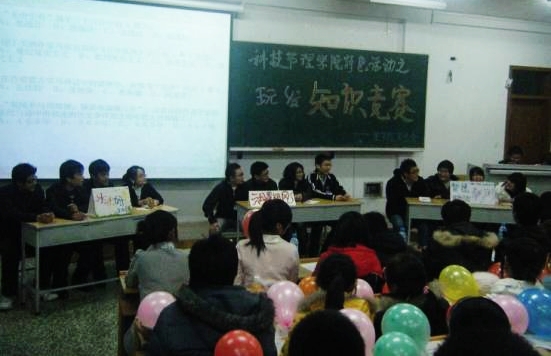 學(xué)生科技競(jìng)賽活動(dòng)豐富多彩,教育意義強(qiáng)。人文學(xué)院舉辦了第四屆“讀書之星”評(píng)比活動(dòng),幫助學(xué)生進(jìn)一步樹立終身學(xué)習(xí)的理念,鼓勵(lì)學(xué)生親近書本,喜愛讀書,學(xué)會(huì)讀書,養(yǎng)成熱愛讀書,博覽群書的習(xí)慣?;顒?dòng)過程中,同學(xué)們通過閱讀中外名著,撰寫讀書心得體會(huì),不僅豐富了專業(yè)知識(shí),拓寬了文化視野,而且也使自身的文化底蘊(yùn)和人文修養(yǎng)得到不斷的提升,收到了啟迪智慧、陶冶情操、對(duì)話心靈的預(yù)期目的;外語(yǔ)學(xué)院舉辦了“外文配音大賽”活動(dòng),進(jìn)行了一次全新嘗試,本著“學(xué)”、“樂”一體的活動(dòng)理念,將教學(xué)與活動(dòng)雙重優(yōu)化,充分調(diào)動(dòng)了學(xué)生學(xué)習(xí)外語(yǔ)的興趣,營(yíng)造出了良好的學(xué)術(shù)氛圍,彰顯了自身特色;輕紡學(xué)院舉辦了“挑戰(zhàn)杯”科技知識(shí)競(jìng)賽。同學(xué)們不僅在輕松愉悅氛圍中掌握了科技知識(shí),又使自身的競(jìng)爭(zhēng)意識(shí)和團(tuán)隊(duì)合作意識(shí)得到增強(qiáng);理學(xué)院舉辦了百科知識(shí)競(jìng)賽,緊緊圍繞“我與科技”這一主題,在豐富課余文化生活的同時(shí),增加了同學(xué)們的知識(shí)儲(chǔ)備,更展現(xiàn)了大學(xué)生的求知意識(shí)和創(chuàng)新能力;通信學(xué)院舉辦的“學(xué)習(xí)經(jīng)驗(yàn)交流,了解專業(yè)前沿”的知識(shí)競(jìng)猜活動(dòng),讓同學(xué)們對(duì)通信電子專業(yè)的前沿知識(shí)有了初步的了解,也加強(qiáng)了同學(xué)們對(duì)所學(xué)專業(yè)的發(fā)展前景的認(rèn)知,進(jìn)一步強(qiáng)化了學(xué)生的專業(yè)思想;生命學(xué)院舉辦的“頭腦風(fēng)暴”知識(shí)競(jìng)賽,競(jìng)賽過程中穿插了文藝表演和互動(dòng)游戲,使同學(xué)們?cè)谳p松的氣氛中學(xué)到知識(shí)。