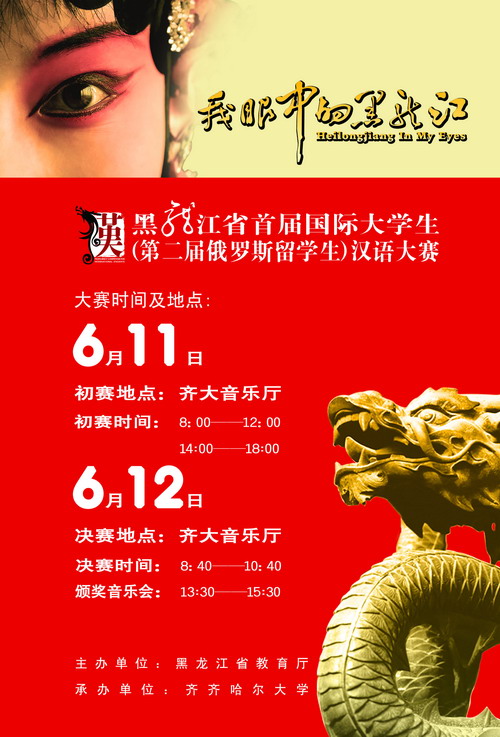 以“我眼中的黑龍江”(Heilongjiang In My Eyes)為主題的2009黑龍江省首屆國際大學生(第二屆俄羅斯留學生)漢語大賽將于明天在我校音樂廳正式拉開序幕。
