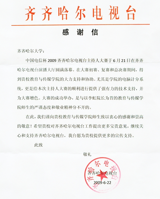 此次大賽圓滿落幕后,齊齊哈爾電視臺專門致函我校,對教育與傳媒學(xué)院的積極協(xié)辦表示了衷心的謝意與崇高敬意,對我校師生的敬業(yè)精神和扎實(shí)的理論基礎(chǔ)、較強(qiáng)的專業(yè)技能等給予了高度評價,并表示,今后將進(jìn)一步加大與我校的合作力度,繼續(xù)為我校提供更多的宣傳支持,為塑造大學(xué)形象、提升學(xué)校聲譽(yù)做出新貢獻(xiàn)。