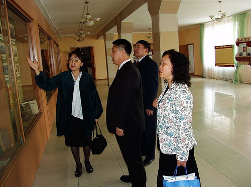 車師大副校長(zhǎng)西瑪托夫先生率外事處長(zhǎng)等六人驅(qū)車到機(jī)場(chǎng)停機(jī)坪上迎接馬立群校長(zhǎng)一行。午餐后馬立群校長(zhǎng)參觀了車大的校園,在校史展柜前,馬立群校長(zhǎng)詳細(xì)地了解了該校的發(fā)展歷史,重要?dú)v史階段和歷史人物。