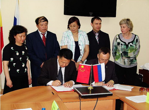 下午5:00,馬立群校長(zhǎng)與卡塔納耶夫校長(zhǎng)舉行了正式會(huì)談,雙方圍繞聯(lián)合辦學(xué)、舉辦孔子學(xué)院、俄羅斯中國(guó)年系列活動(dòng)等三個(gè)主題展開(kāi)熱烈友好的討論,在達(dá)成一致意見(jiàn)的基礎(chǔ)上,雙方校長(zhǎng)在聯(lián)合辦學(xué)的協(xié)議上簽字。