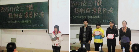 該院14名選手分別以他們飽滿的熱情和對(duì)祖國(guó)的無限熱愛描述了中國(guó)改革開放三十年來天翻地覆的變化和對(duì)改革開放的無限贊美,現(xiàn)場(chǎng)氣氛活躍振奮,掌聲熱烈。最終計(jì)本081班劉佳的《征程三十載,輝煌在東方》榮獲一等獎(jiǎng)。軟件081班王會(huì)敏的《改革開放,再創(chuàng)輝煌》和自動(dòng)化081班王麗婧的《情系1978》榮獲二等獎(jiǎng)。軟件082班的李嘉祥、自動(dòng)化081班的韓興龍、計(jì)本085班的卓越榮獲三等獎(jiǎng)。