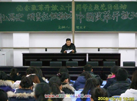 為了深入學(xué)習(xí)貫徹黨的十七大,全面學(xué)習(xí)實(shí)踐科學(xué)發(fā)展觀,隆重紀(jì)念改革開放30周年,進(jìn)一步激發(fā)當(dāng)代青年的愛國(guó)熱情,凝聚青春智慧,投身科學(xué)發(fā)展, 12月10日經(jīng)管學(xué)院舉辦了由輔導(dǎo)員樊友才老師主講的主題為“憶歷史 明責(zé)任 做貢獻(xiàn)” 中國(guó)改革開放30年的專題講座,該院全體學(xué)生黨員參加。樊老師從中國(guó)改革開放30年思想解放的三次突破、從人治到法制再到法治的社會(huì)轉(zhuǎn)型、經(jīng)濟(jì)發(fā)展的鴻篇巨著、當(dāng)代青年的歷史責(zé)任四個(gè)方面向同學(xué)們作了詳細(xì)地闡述。并激勵(lì)青年學(xué)生認(rèn)清形勢(shì),明確使命,勇挑重?fù)?dān),在建設(shè)中國(guó)特色社會(huì)主義的偉大歷史進(jìn)程中發(fā)揮先鋒模范作用,做出自己的貢獻(xiàn)。通過本次黨日活動(dòng),全體學(xué)生黨員在思想上受到了一次深刻的教育,大家紛紛表示,在今后的學(xué)習(xí)、工作中將以自己的實(shí)際行動(dòng)更好地發(fā)揮黨員的先鋒模范作用,努力踐行十七大精神,爭(zhēng)當(dāng)先鋒,為構(gòu)建和諧校園作出自己更大的貢獻(xiàn)。