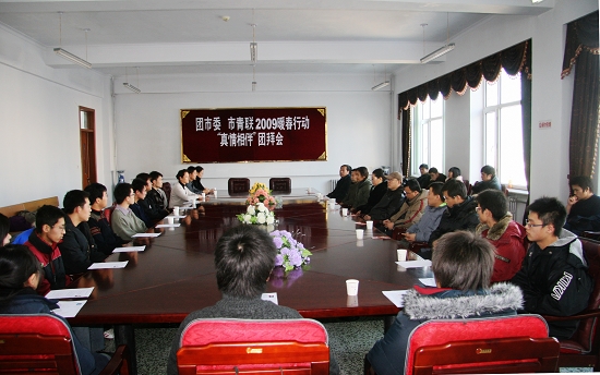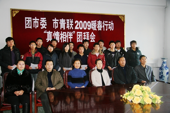 為貫徹實(shí)施“團(tuán)市委、市青聯(lián)2009暖春行動(dòng)”,1月17日上午,團(tuán)市委書記那君喆帶領(lǐng)團(tuán)市委、市青聯(lián)領(lǐng)導(dǎo)班子成員來我校慰問家庭經(jīng)濟(jì)困難學(xué)生,在我校西主606會(huì)議室召開了“團(tuán)市委、市青聯(lián)2009暖春行動(dòng)‘真情相伴’團(tuán)拜會(huì)”。