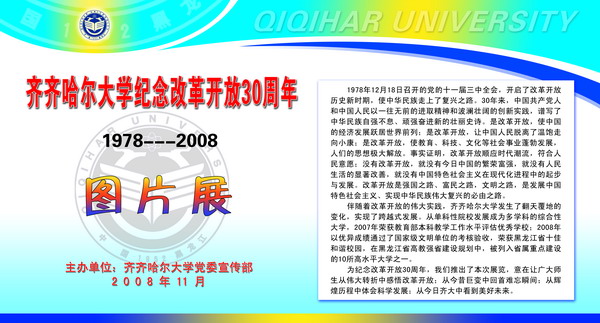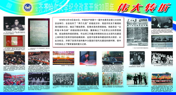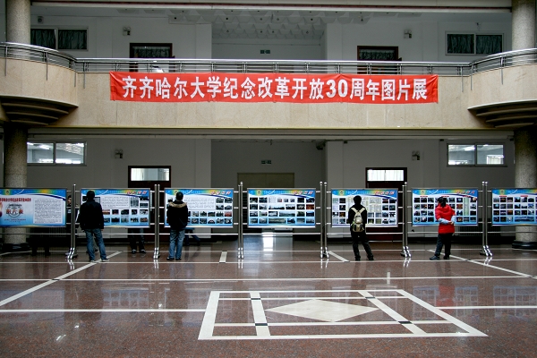 在紀(jì)念改革開放30周年之際,校黨委宣傳部在西區(qū)主樓陽光大廳舉辦了“齊齊哈爾大學(xué)紀(jì)念改革開放30周年圖片展”。本次展覽,意在讓廣大師生從偉大轉(zhuǎn)折中感悟改革開放;從今昔巨變中回首難忘瞬間;從輝煌歷程中體會(huì)科學(xué)發(fā)展;從今日齊大中看到美好未來。