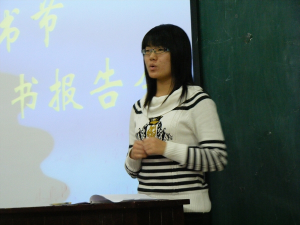 12月3日,由校團(tuán)委主辦的我校首屆讀書(shū)節(jié)“陽(yáng)光學(xué)子”讀書(shū)報(bào)告會(huì)在西主階梯203室成功舉行。經(jīng)各學(xué)院推選的15 名優(yōu)秀讀書(shū)報(bào)告人為大家作了精彩的報(bào)告,校團(tuán)委馮占元老師與我校各學(xué)院學(xué)生代表100余人聽(tīng)取了報(bào)告。