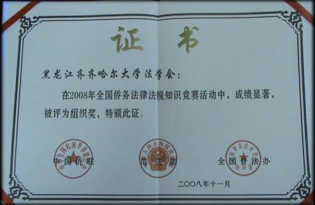 本次競(jìng)賽活動(dòng)共有300余個(gè)單位參加,收到有效答卷70多萬(wàn)份。我校法學(xué)會(huì)積極組織廣大同學(xué)參加,并榮獲了全國(guó)“僑務(wù)法律法規(guī)有獎(jiǎng)知識(shí)競(jìng)賽”的組織獎(jiǎng)。齊齊哈爾大學(xué)法學(xué)會(huì)會(huì)長(zhǎng)、人文學(xué)院政治系主任呂途副教授說(shuō),能夠獲此殊榮,既是我校法學(xué)會(huì)多年來(lái)積極開(kāi)展普法宣傳工作的生動(dòng)體現(xiàn),也是我校普法宣傳工作不斷取得新成效的集中反映。