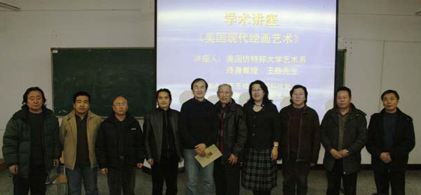 應(yīng)我校藝術(shù)學(xué)院等有關(guān)部門的邀請,美國仿特邦大學(xué)藝術(shù)系終身教授王勝博士于12月11日上午10點,在校藝術(shù)中心206教室為藝術(shù)學(xué)院師生作了題為《美國現(xiàn)代繪畫藝術(shù)》的講座。藝術(shù)學(xué)院繪畫系、美術(shù)系和設(shè)計系的部分師生以及08級設(shè)計藝術(shù)學(xué)研究生聽取了講座。