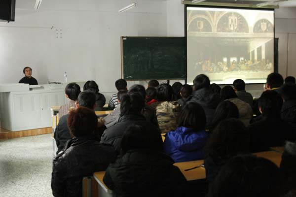 王勝博士以“什么是藝術(shù)”為引子,介紹了美國現(xiàn)代繪畫藝術(shù)的發(fā)展概況,然后就相關(guān)課題表達了自己的見解,最后他和大家分享了他的藝術(shù)創(chuàng)作經(jīng)歷并觀看了他的作品圖片。他的作品把中國元素融入到油畫創(chuàng)作中,以“舞臺”和“生活”的矛盾性為表現(xiàn)內(nèi)容,引起了與會師生的強烈共鳴。