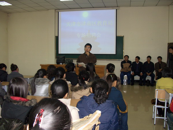 2008年11月11日,天津市津南區(qū)教育局一行13人,由教育局副局長帶隊,會同津南區(qū)人事局、津南區(qū)紀委、津南區(qū)教育局教育研究室及相關(guān)中學(xué)的校長,組成專家招聘團來我校集中選聘人才。經(jīng)過資格審查、筆試、面試、試講等一系列環(huán)節(jié),我校共有地理、化學(xué)、歷史、數(shù)學(xué)、中文5個專業(yè)的16名畢業(yè)生與用人單位成功簽訂了就業(yè)協(xié)議。