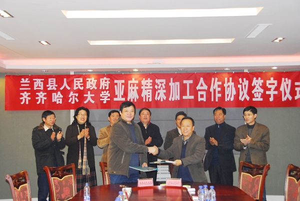 在此基礎(chǔ)上,經(jīng)雙方共同商洽,我校與蘭西縣達(dá)成了有關(guān)亞麻精深加工合作協(xié)議。隨后,我校副校長鄧啟剛與蘭西縣縣長王秀平分別代表雙方簽訂了??h合作協(xié)議。