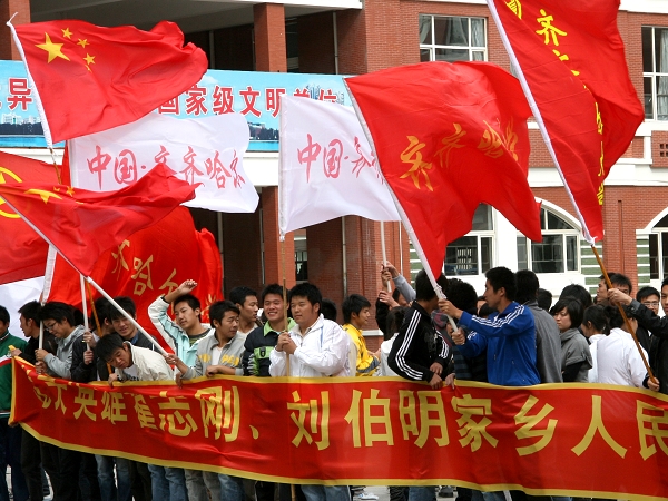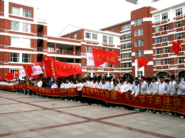 25日中午,我校師生在中區(qū)主樓廣場(chǎng)舉行慶祝活動(dòng),祝愿神七飛天使命圓滿成功,并為即將漫步太空的航天英雄加油。執(zhí)行“神舟七號(hào)”載人航天飛行任務(wù)的三名航天員中,翟志剛和劉伯明均來(lái)自齊齊哈爾地區(qū)。龍江大地走出來(lái)的航天英雄鼓舞著家鄉(xiāng)的學(xué)子。參加活動(dòng)的同學(xué)們紛紛表示:在建國(guó)59周年來(lái)臨之際,神七飛天是全中國(guó)人民的又一件大喜事,我們?yōu)樽鎳?guó)的不斷發(fā)展進(jìn)步而驕傲和自豪!