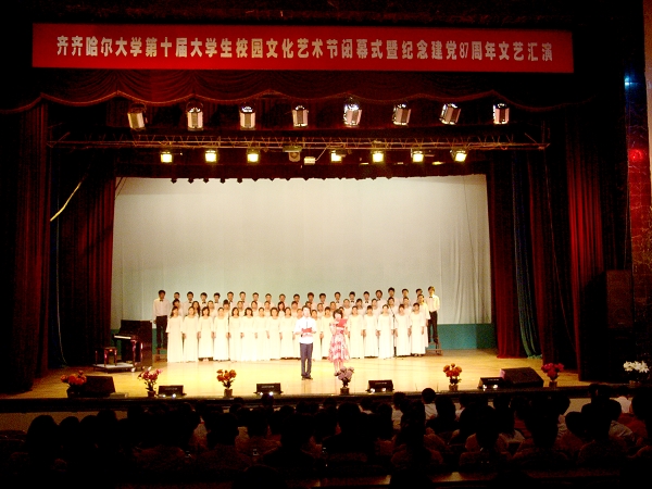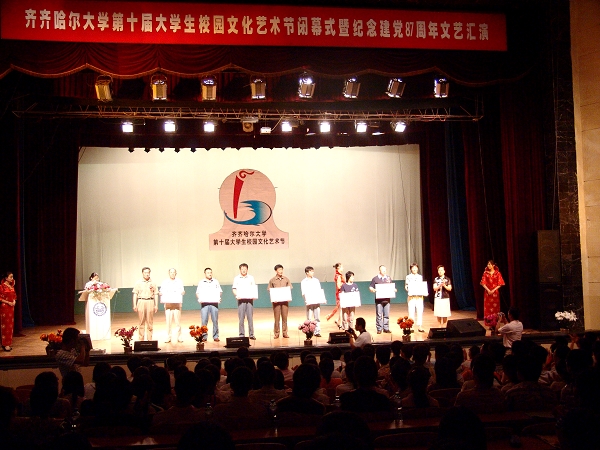 6月25日下午1:30,我校第十屆大學(xué)生校園文化藝術(shù)節(jié)閉幕式暨紀(jì)念建黨87周年文藝匯演在中區(qū)文化宮隆重舉行。副校長(zhǎng)姜守訓(xùn)宣讀了《齊齊哈爾大學(xué)第十屆大學(xué)生校園文化藝術(shù)節(jié)獲獎(jiǎng)集體和個(gè)人名單》,黨委副書記王鳳琴、副校長(zhǎng)姜守訓(xùn)、校團(tuán)委書記黃偉中、學(xué)工處處長(zhǎng)王剛為獲獎(jiǎng)集體和個(gè)人頒獎(jiǎng),閉幕式由校團(tuán)委副書記李秀梅主持。