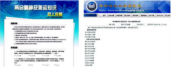 為使廣大學(xué)生深化對今年“兩會”各項(xiàng)方針、政策的認(rèn)識和了解,更廣泛地普及奧運(yùn)知識,充分調(diào)動我校學(xué)生喜迎奧運(yùn)、參與奧運(yùn)、支持奧運(yùn)的熱情,掀起愛國主義教育新高潮,學(xué)生工作處(部)于5月10日起面向全校學(xué)生開展了一次網(wǎng)上知識競賽。