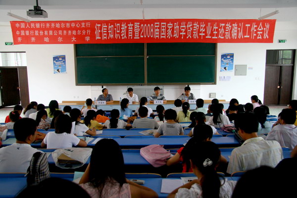 中國人民銀行齊齊哈爾中民支行調(diào)查統(tǒng)計(jì)科科長黃可權(quán)、中國銀行齊齊哈爾分行個人金融部主任吳小微、副主任殷永剛代表銀行方對中國銀行貸款畢業(yè)生進(jìn)行了征信教育,中國銀行齊齊哈爾分行個人金融部客戶經(jīng)理鄭德剛對中國銀行貸款畢業(yè)生就還款確認(rèn)工作的業(yè)務(wù)知識進(jìn)行了精心指導(dǎo);華安財(cái)產(chǎn)保險(xiǎn)股份有限學(xué)貸險(xiǎn)黑龍江分部苑彬總經(jīng)理、哈爾濱銀行動力支行國家助學(xué)貸款管理中心聶寰中主任帶領(lǐng)相關(guān)工作人員一行五人對中國銀行哈爾濱支行17名貸款畢業(yè)生進(jìn)行了征信教育并為其辦理了還款確認(rèn)手續(xù)。學(xué)生工作處副處長吳寶柱代表學(xué)校國家助學(xué)貸款工作辦公室(學(xué)生工作處)對1240名貸款畢業(yè)進(jìn)行了離校前誠信教育并勉勵畢業(yè)生以實(shí)際行動回報(bào)社會。